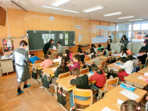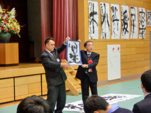 11月18日(金)東近江市立蒲生北小学校・朝桜中学校・滋賀県立八日市高等学校を会場として公開授業・部会別学年別研究協議会ならびに全体会を実施、128名が参加しました。蒲生北小学校では、全学年の授業が公開されました。授業者の先生方も、子どもたちとともに楽しもうとする姿勢がうかがえ、のびのびとした書写の授業が展開されました。朝桜中学校は班別で今年の漢字1 字に小書きを添える授業、八日市高校は隷書を共同制作し鑑賞発表会を行うという内容でした。全体会では、岐阜女子大学非常勤講師の戸崎浩志先生に「滋賀県の書写教育から学んだこと~楽しい書写授業をめざして~」と題しご講演いただきました。先生ご自身が小中学校の現場の教員・校長としての書写の授業の経験から、授業改善の必要性を感じ、滋賀県の書教育を知って衝撃をうけた事柄など丁寧にお話しいただきました。滋賀で学ばれたことを岐阜女子大学などで学生に指導し、その実践の 模様をDVDや実際の作品で見せていただきました。