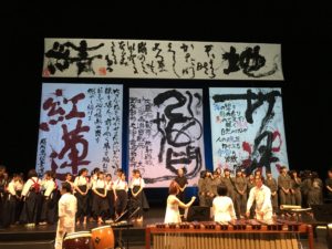 4月29日(土・祝)、びわ湖ホールで標記の公演が開催されました。今年は4名の打楽器奏者が奏でる音楽にのせて、大津・伊吹・膳所の3高校の書道部がそれぞれ「アフリカン」「ガムラン」「スパニッシュ」をテーマに書道パフォーマンスを披露。最後に書道協会副理事長の三原 博、監事の井岡正宣のお二人の先生が「アイリッシュ」をテーマに揮毫されました。打楽器のリズムに合わせ、井岡先生が横長の紙の左右に「地」「精」の篆書を大書。中央に三原先生が、万葉集巻七「あまぎらひ……」で始まる和歌を気合を込めて書き上げられました。今年は打楽器奏者の方が、書道の書き手の動きに合わせて即興で曲を奏でるシーンもあり、例年以上に、コラボレーションの要素が濃くなり、すばらしい感動的なステージとなりました。たくさんの方々にご来場いただきました。